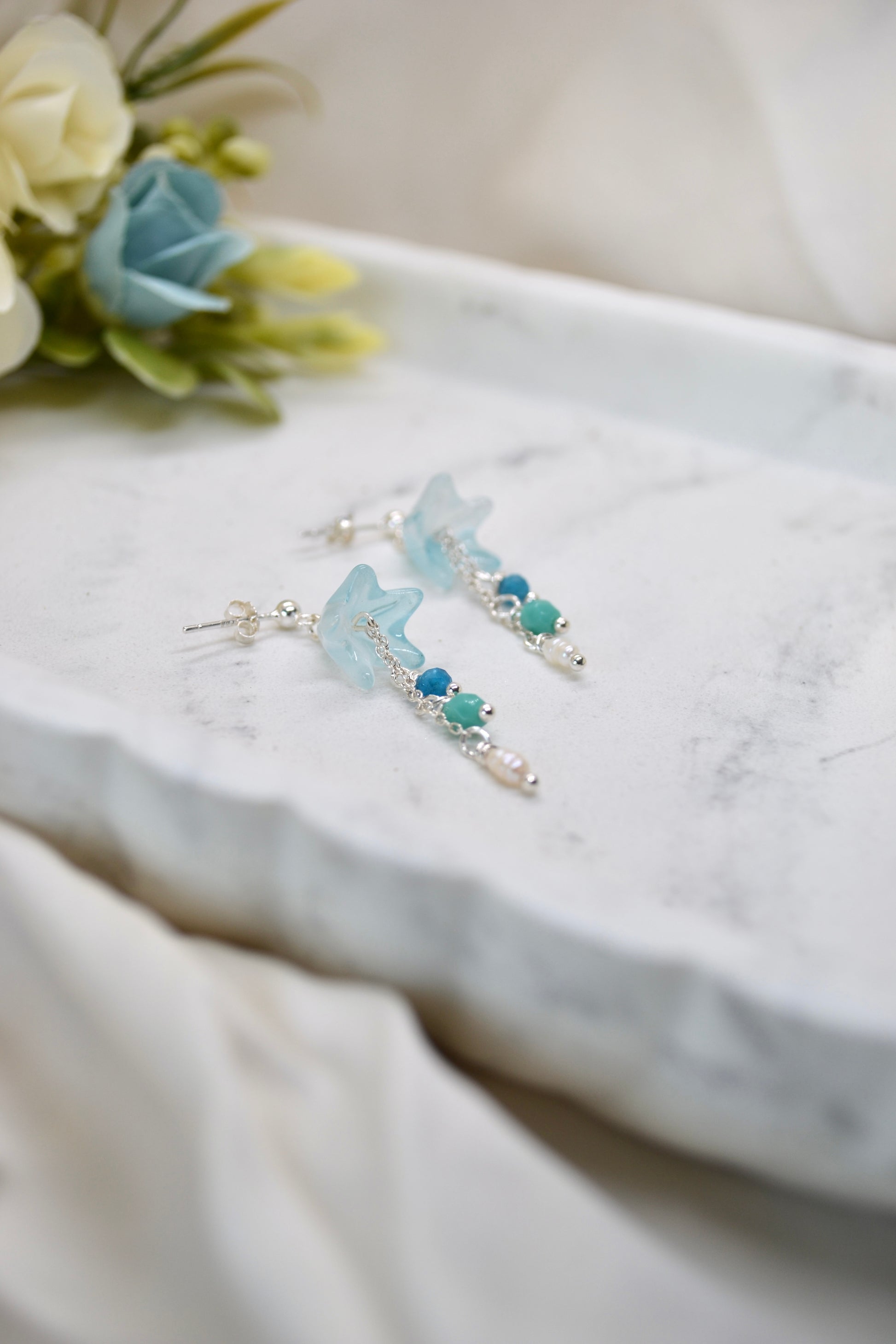Blue Bell Flowers, Pearls and Apatite Crystals Earrings