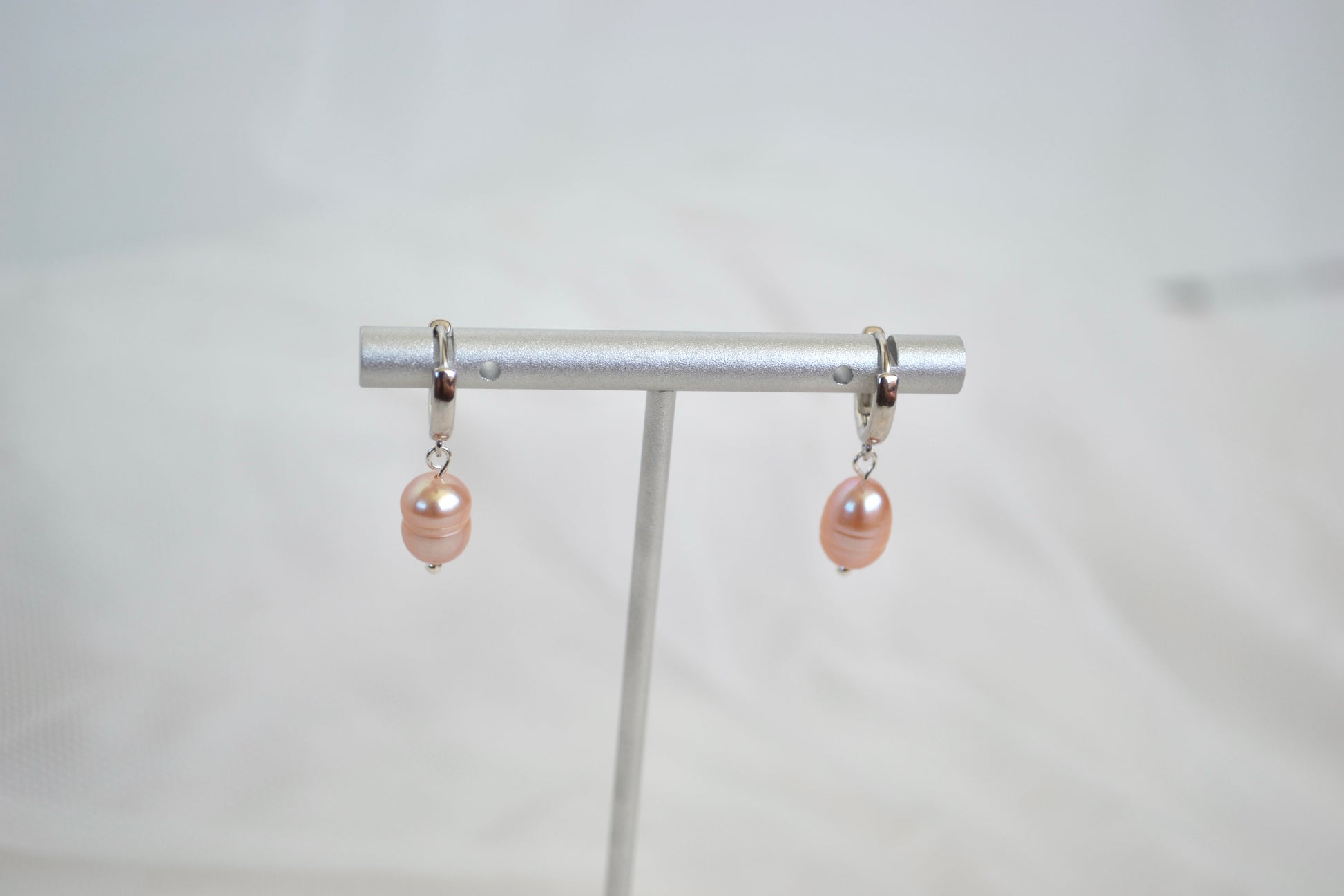 These Sterling Silver champagne Pearl Huggies blend classic elegance with a playful, modern touch. Crafted from 925 sterling silver, the sleek huggie hoop is finished with a delicate pink pearl that gently dangles, adding movement and soft shimmer with every turn.