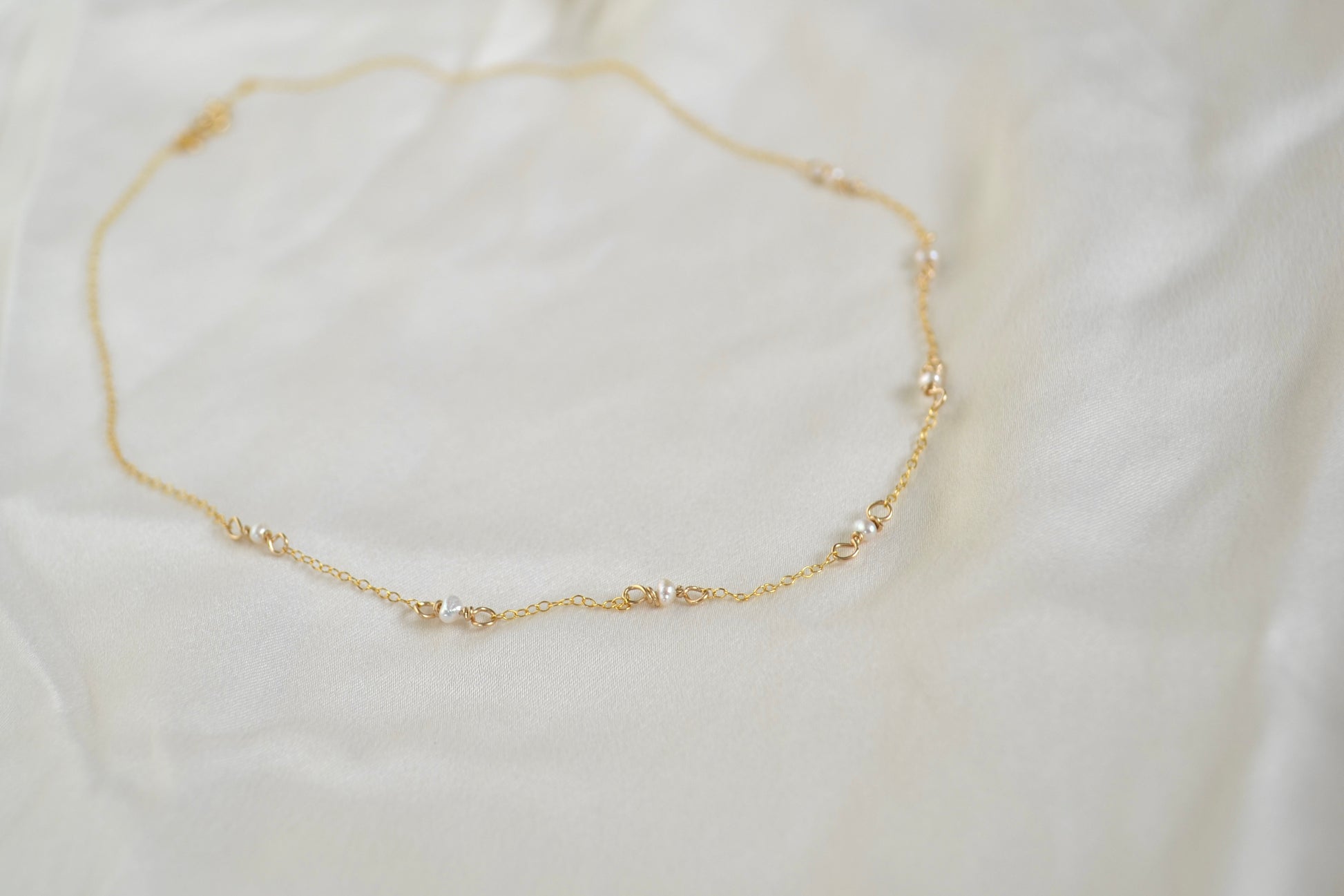 The Delicate Pearl Choker Necklace exudes effortless grace with its refined simplicity. Featuring a row of petite, luminous freshwater pearls strung along a fine 14k gold filled chain, this piece sits elegantly at the collarbone — offering a timeless, feminine glow. Perfect for layering or wearing alone, it’s a versatile design that transitions seamlessly from everyday so