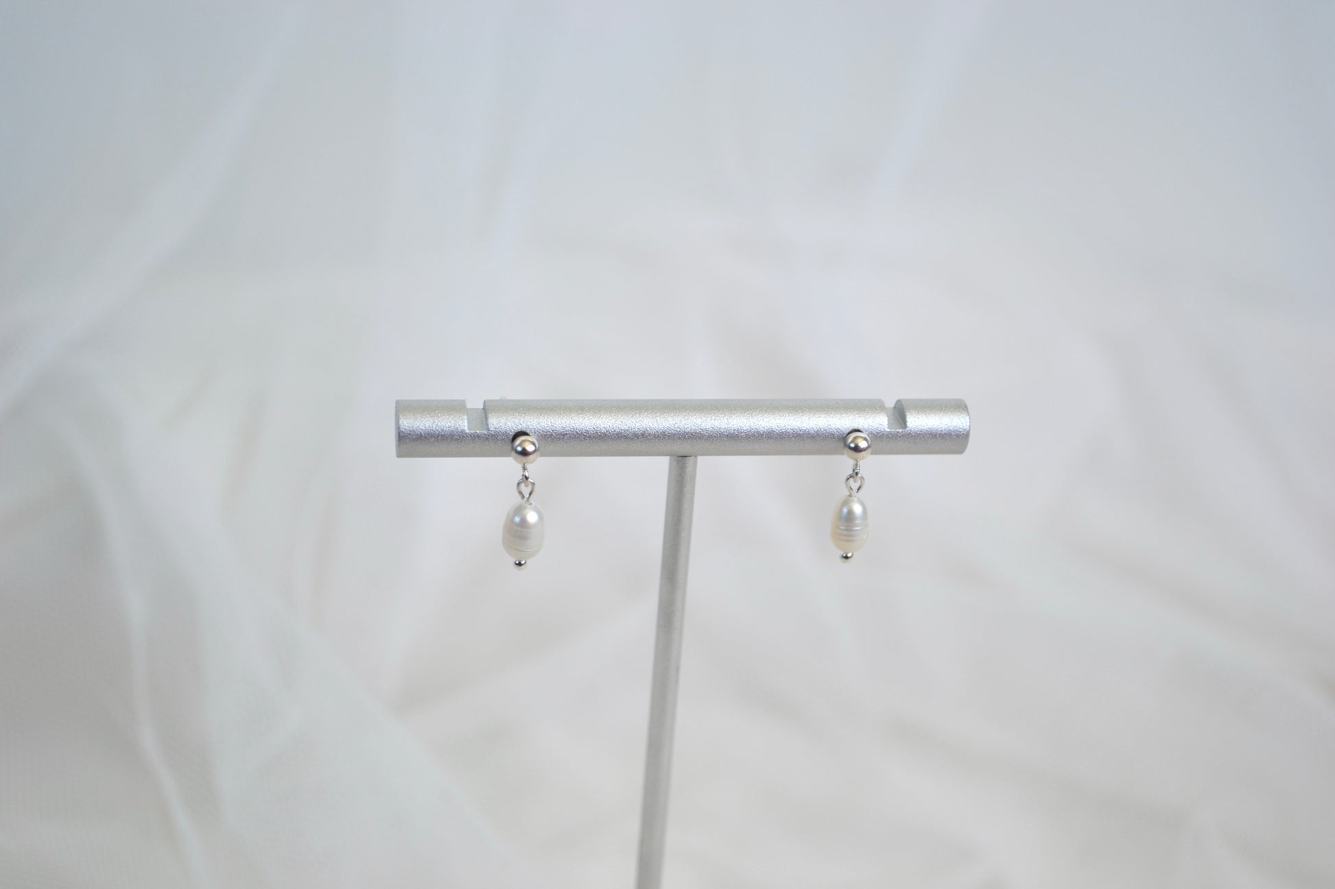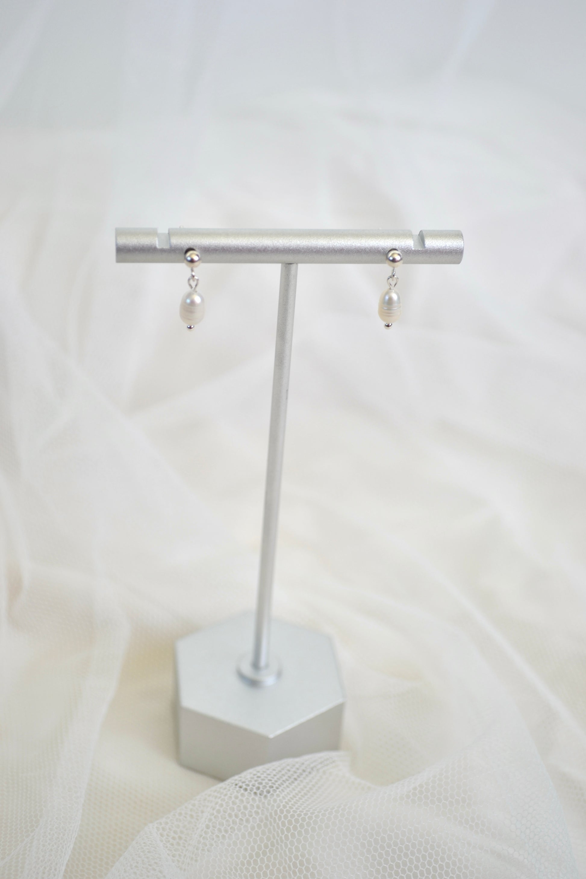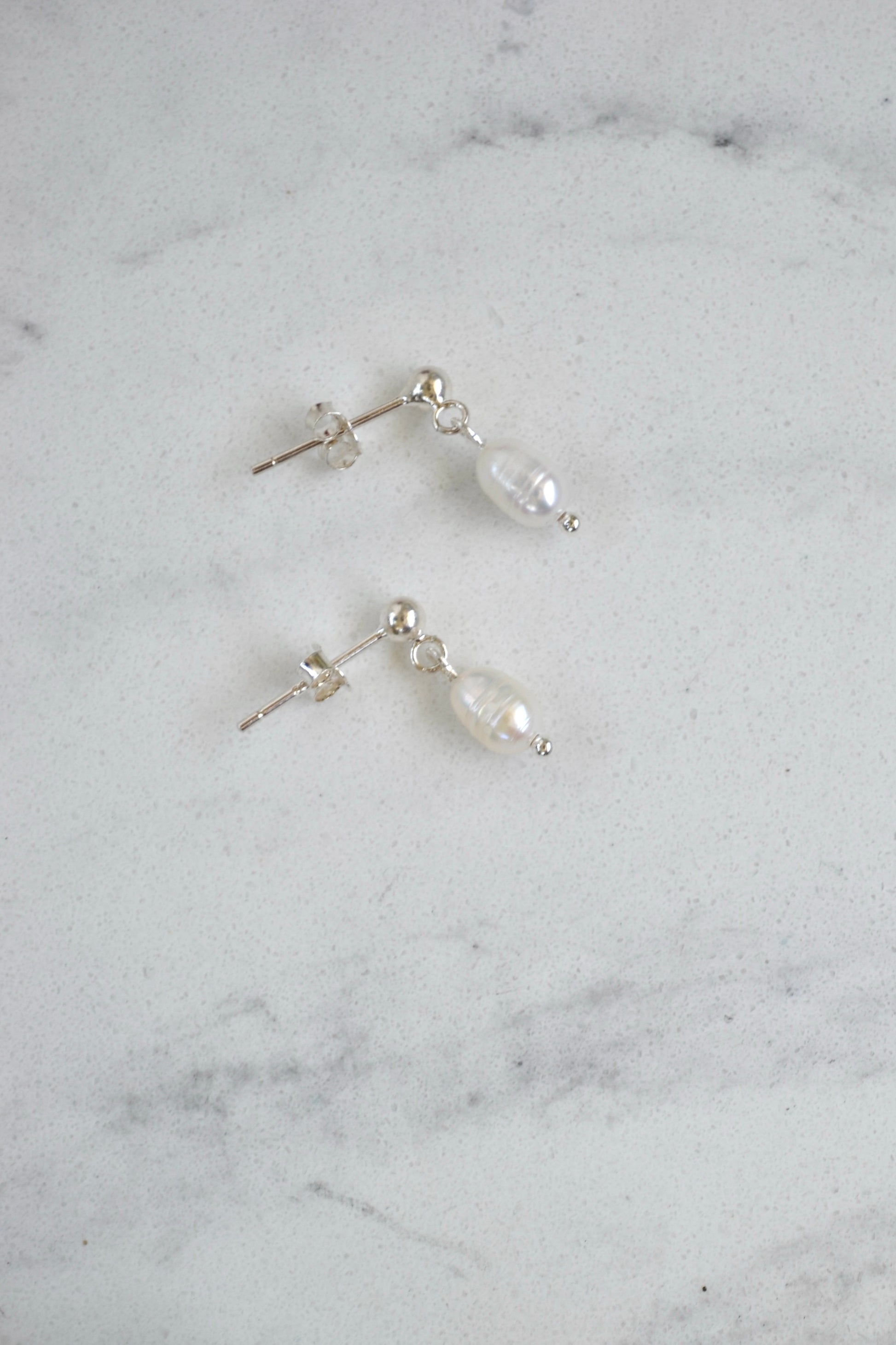 Delicate pearl stud earrings crafted in sterling silver, designed for effortless elegance. Each luminous pearl is set in polished silver, creating a timeless, minimalist look that complements any style.