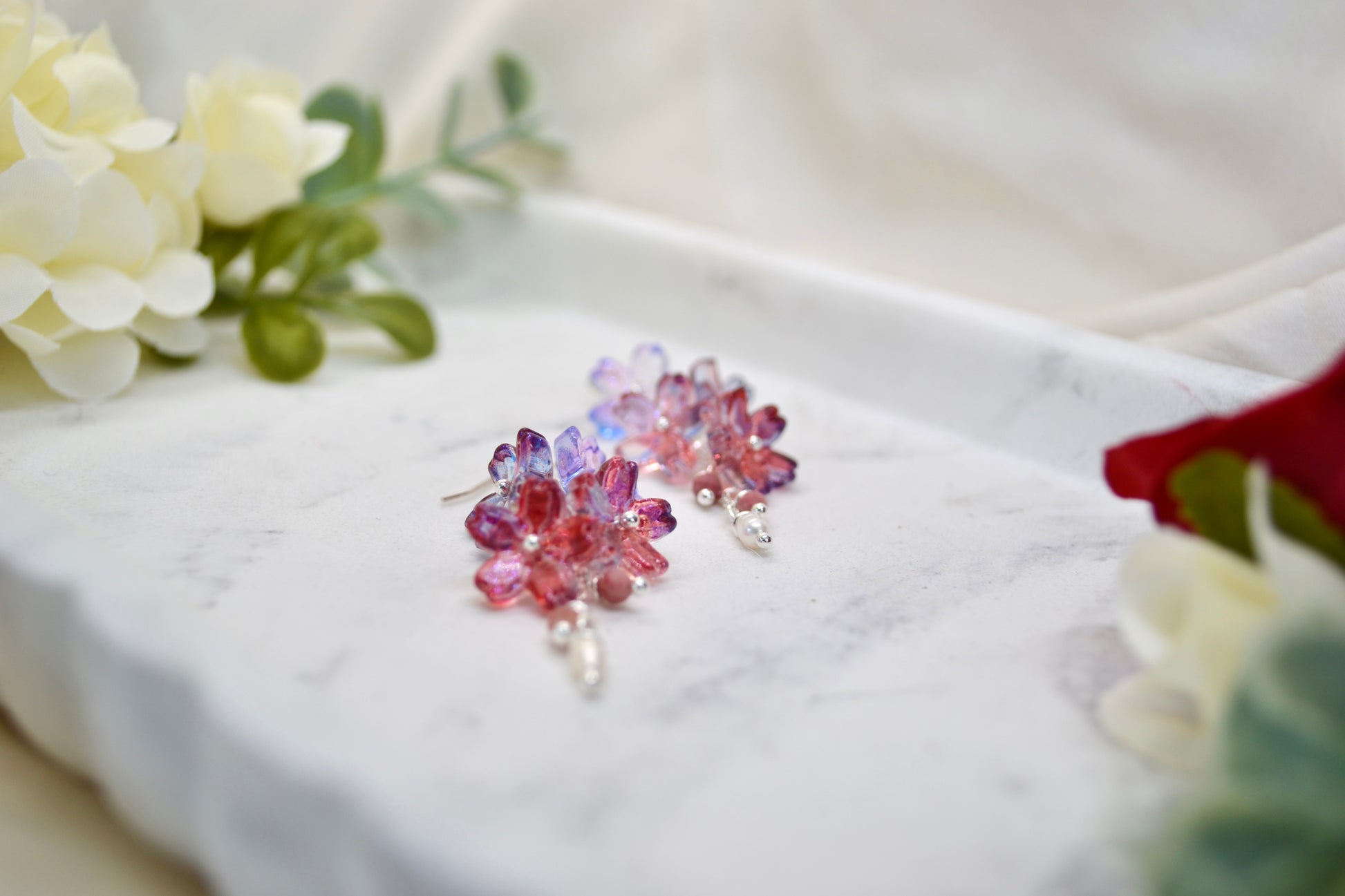 These enchanting sterling silver earrings combine elegance with symbolism. Suspended on a fine chain, each earring features delicate red and purple flowers accented with luminous pearls and soft pink rhodochrosite crystal beads. The gentle sway of the design brings a touch of movement and light, making them as playful as they are graceful.