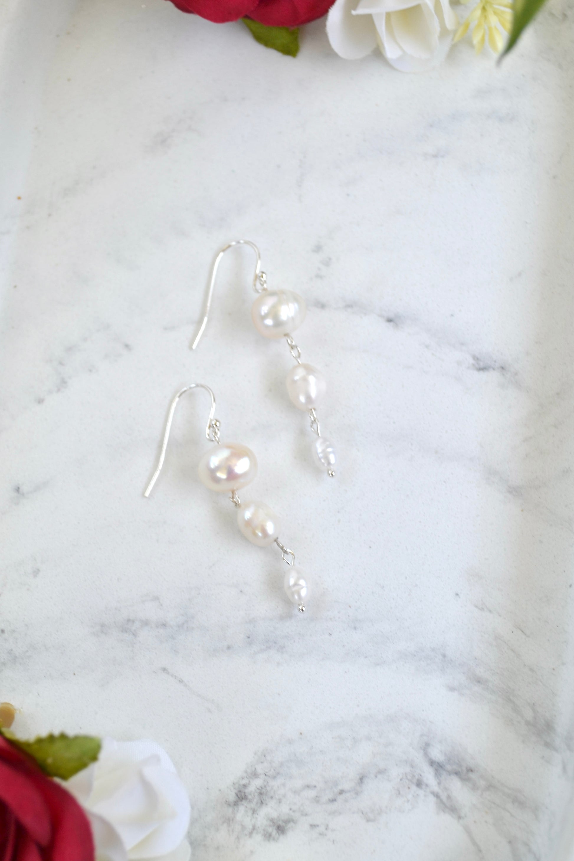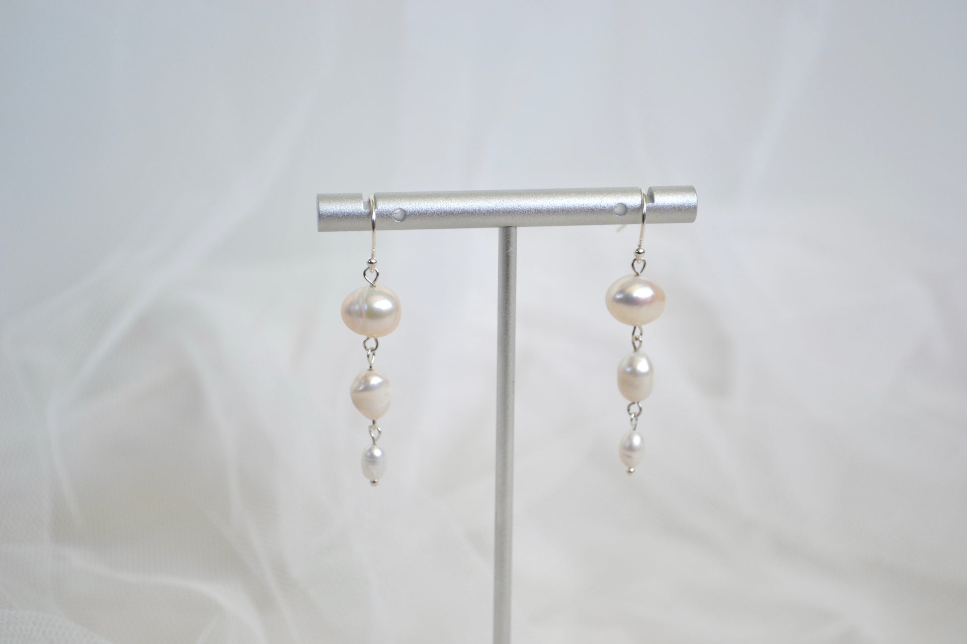 Elegant and eye-catching, these Sterling Silver Gradient Pearl Drop Earrings feature a graceful cascade of pearls that subtly shift in size for a beautifully balanced, flowing effect. Set on polished sterling silver, the pearls catch the light with a soft, luminous glow and create gentle movement with every step.