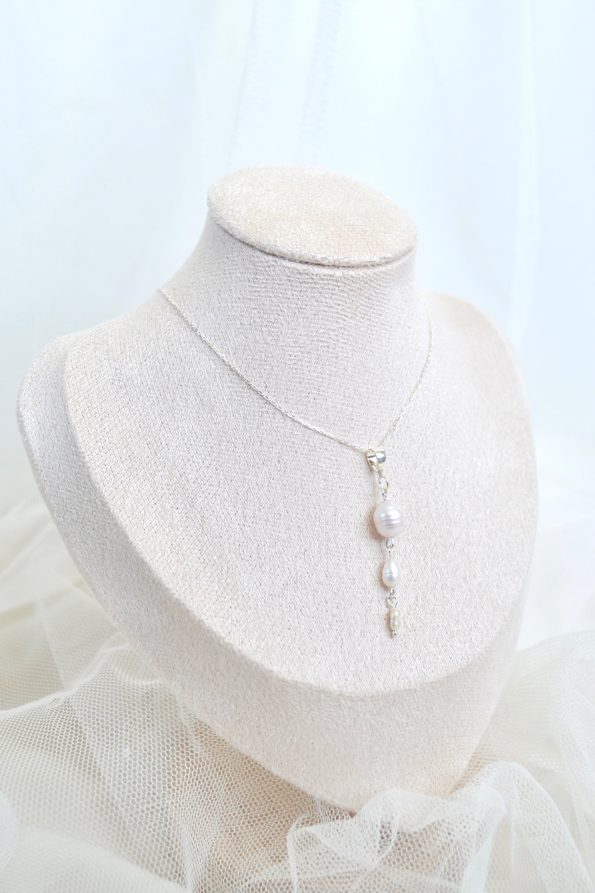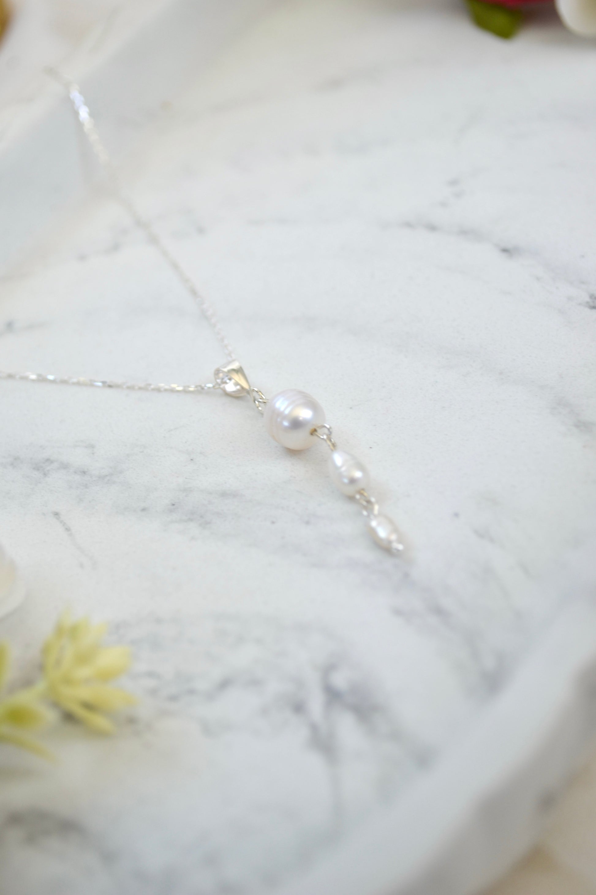 A timeless symbol of elegance, this gradient pearl necklace features three radiant white pearls arranged in a soft, graceful progression. Set with polished sterling silver accents, the design highlights the pearls’ natural luster without overpowering their beauty. Delicate and luminous, this necklace is a perfect wedding or evening piece—ideal for woman seeking classic sophistication, romantic simplicity, or a meaningful keepsake for the special day. And is equally perfect for effortless everyday sophistication.