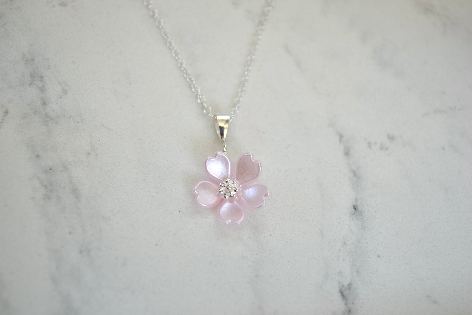 A delicate pink flower necklace crafted in sterling silver, designed to add a soft, romantic touch to any look. The finely detailed flower features gentle pink tones that catch the light beautifully, while the polished sterling silver setting adds a subtle, elegant shine. Timeless and feminine, this necklace is perfect for everyday wear or as a thoughtful gift for someone special—bringing a hint of floral charm and effortless elegance to any outfit.