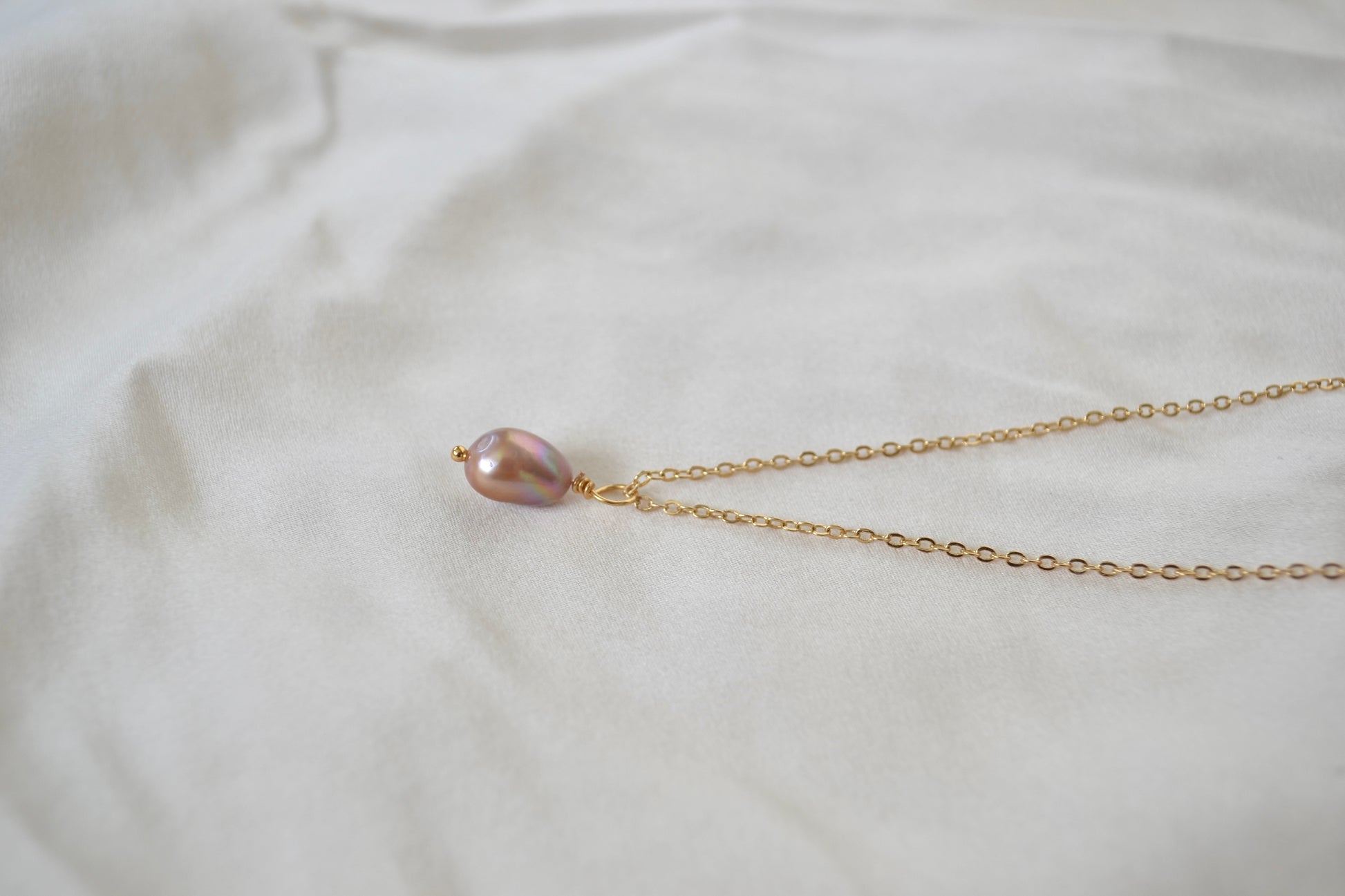 This delicate necklace features a single purple pearl, beautifully set on a 14K gold filled chain. Its minimalist design is timeless, perfect for layering or wearing alone for understated elegance. A versatile piece that adds a touch of sophistication to both everyday outfits and special occasions.