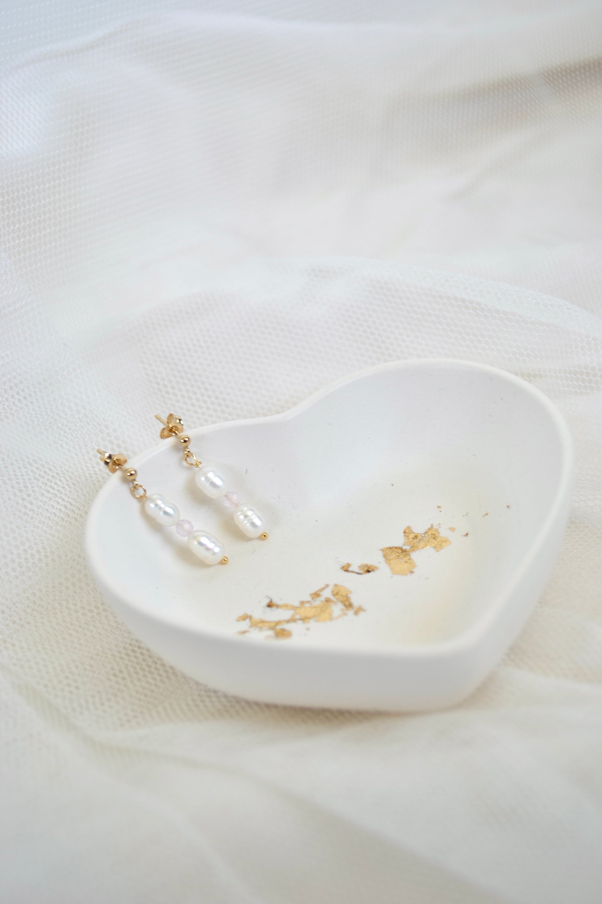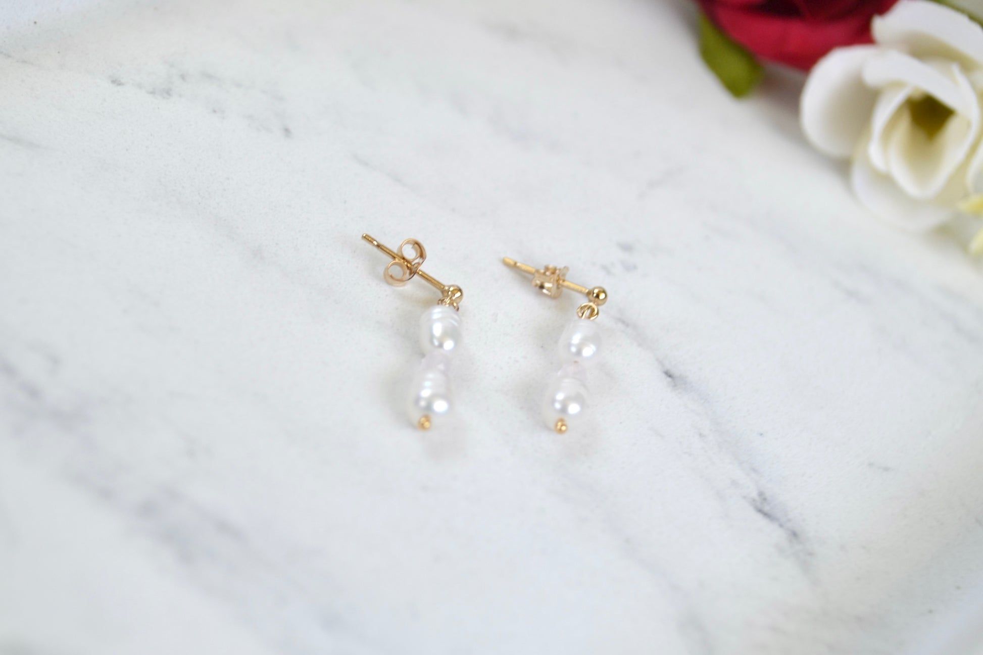 Elevate your everyday elegance with these Pearl & Rose Quartz Dangling Studs. Expertly handcrafted with white freshwater pearls and soft rose quartz gemstones, each earring hangs gracefully from a delicate 14k gold filled stud for a look that’s both timeless and feminine.