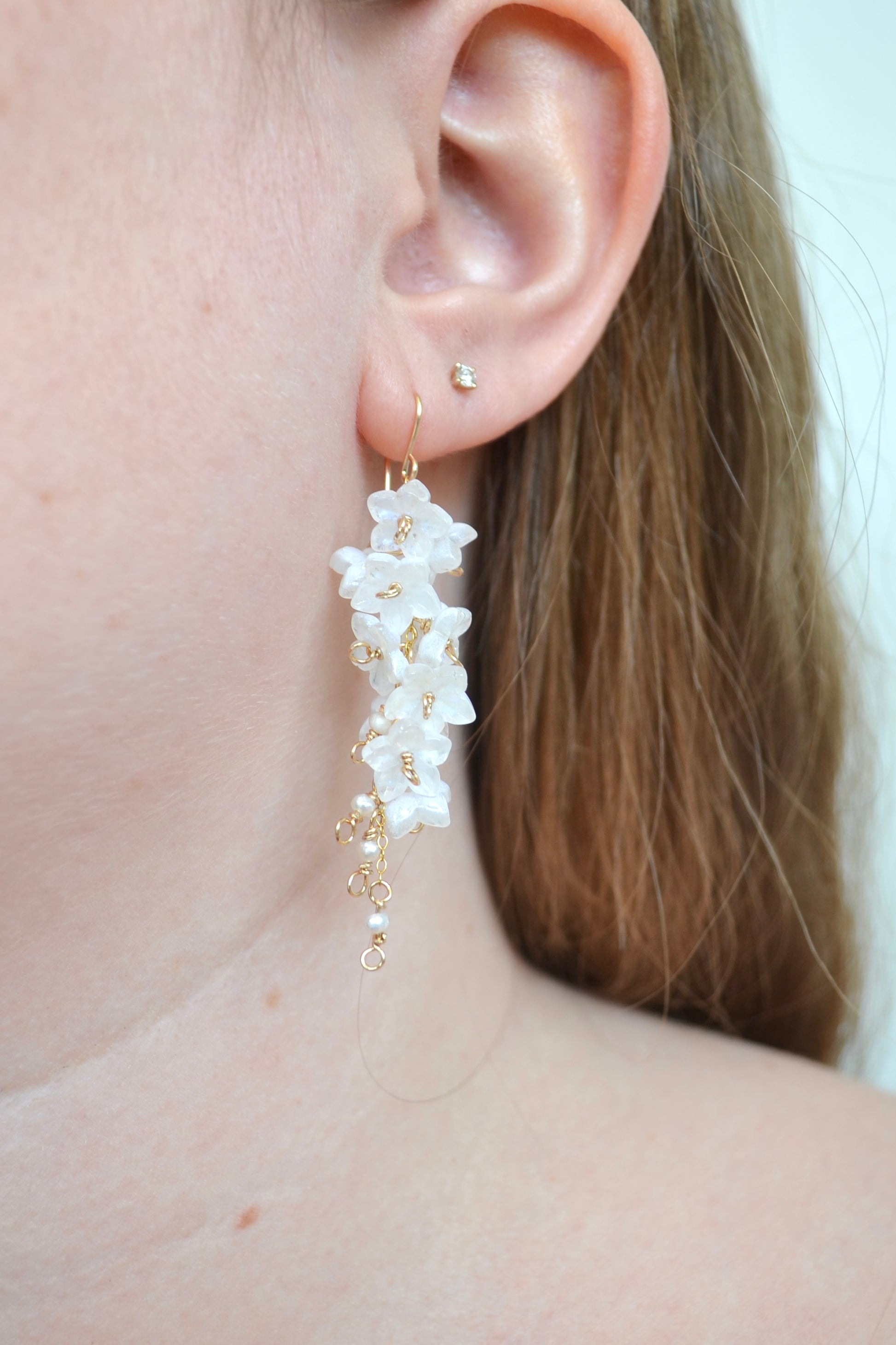 Each pair features dainty white glass flowers that shimmer softly, paired with glowing pearl drops that fall in a gentle, cascading design. The 14k gold filled metal ensures lasting shine and quality, making these earrings perfect for special occasions, weddings, or simply to add a touch of magic to your everyday style.